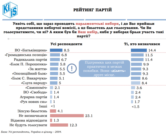 Якщо оцінювати електоральний потенціал як сумарну підтримку перший/другий вибір, то відносно найбільший потенціал мають ВО "Батьківщина" (12,7%) і "Громадянська позиція" (11,3%).