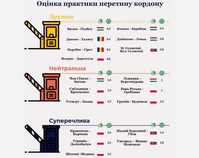 Тобто чотири пункти пропуску, що є на території Львівщини, увійшли у п'ятірку найгірших за цим показником. Усього на Львівщині є шість пунктів пропуску. Ще двом пунктам пропуску, які є на Львівщині: Грушів – Будомєж та Смільниця – Кросценко та Рава-Руська – Гребенне, поставили «нейтральну» оцінку за цим показником. І жоден пункт пропуску на Львівщині не увійшов до групи «дружність» за швидкістю перетину кордону.