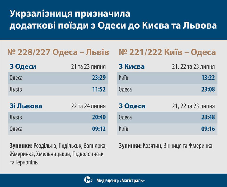 Два додаткових поїзди курсуватимуть з Одеси до Києва та Львова в липні.
