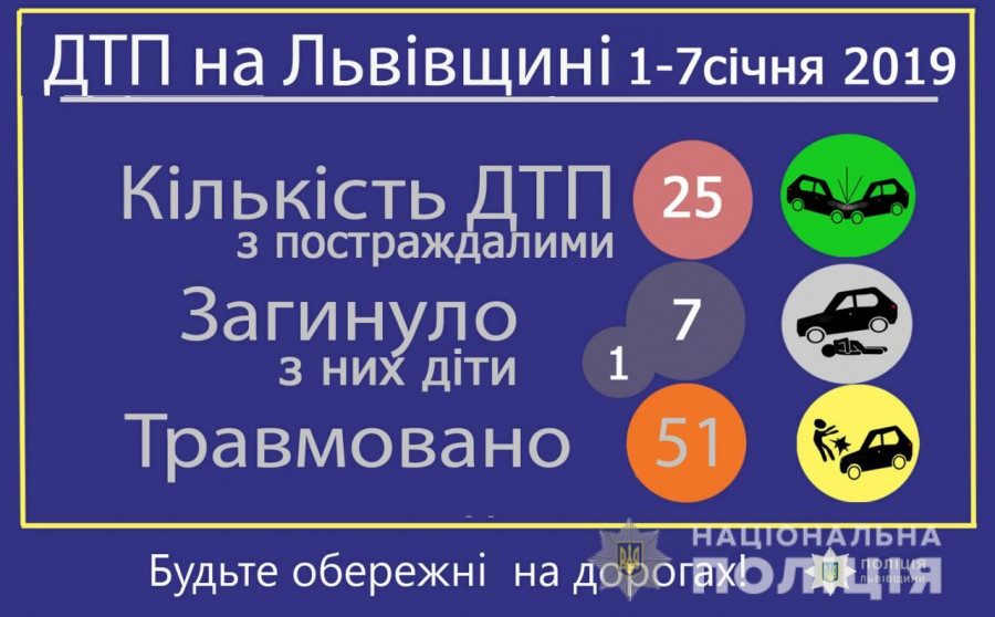 Впродовж перших семи днів 2019 року на дорогах Львівщини 7 осіб загинуло, 51 – травмовано. Про це повідомили у Відділі комунікації поліції Львівської області.
