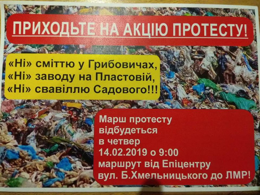 Завтра, 14 лютого, о 9 годині ранку у Львові розпочнеться Марш протесту. Активісти виступають проти будівництва сміттєпереробного заводу на Пластовій, 13 та проти сміття у Грибовичах.
