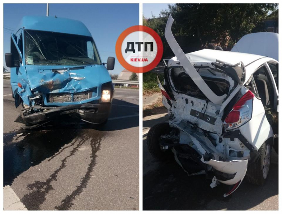 Водій мікроавтобуса Мерседес на повному ходу врізався в задню частину легкового автомобіля Форд, який зупинився на нерегульованому пішохідному переході, пропускаючи пішохода, повідомили на своїй сторінці в Фейсбук dtp.kiev.ua